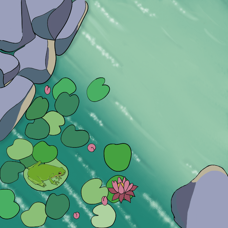 Letade efter inspiration på Pinterest och sparade ner några bilder. Allt mer i skiss stadiet fick jag en benägenhet över att förändra. Skapa en mer fantasifull bild från tanken. Testade olika placeringar för näckrosbladen och valde att placera dom i det vänstra nedre hörnet. Blev en ny utmaning att rita vatten i Sketchbook appen på surfplattan.