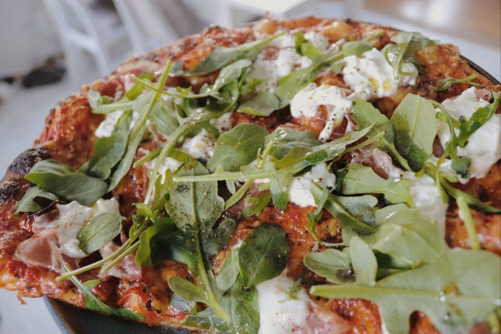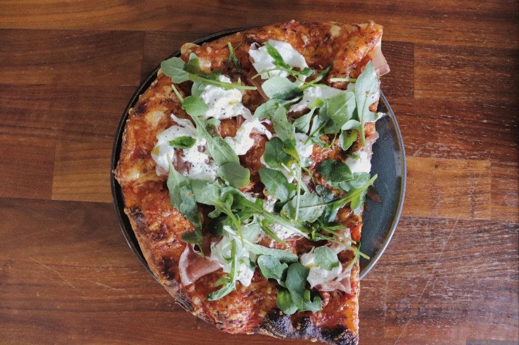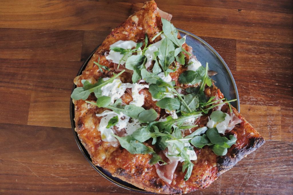 Igår blev det en snabb middag med färdig pizzabotten – krispig i kanten och precis lagom mjuk inuti. Toppad med tomatsås, parmaskinka, plommontomater, burrata och avslutningsvis ruccola. Salt, syrligt, krispigt och mjukt. Allt på samma gång.